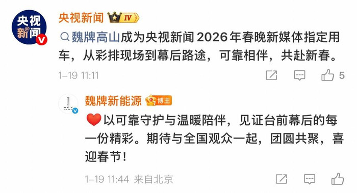 近日,中央广播电视总台正式官宣,长城汽车再度携手央视春晚,连续两年当选央视新闻2026年春晚新媒体指定用车。旗下魏牌高山、全新坦克500双旗舰车型担纲专属保障用车,以安全、智能、高品质驾乘体验,全程护航春晚新媒体报道与台前幕后出行。