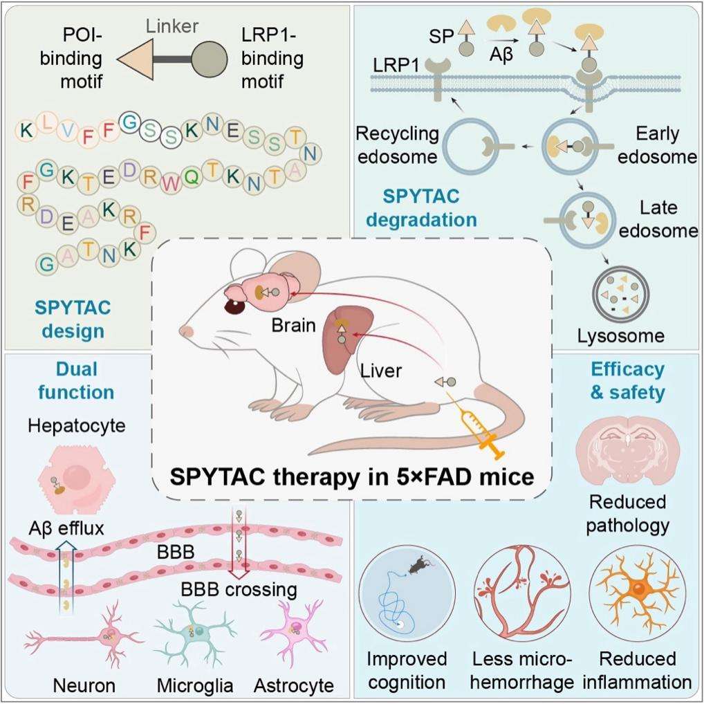 针对这一难题,中国科学院大学医学院滕飞副教授与中国科学院动物研究所李伟研究员、胡宝洋研究员、周琪研究员联合团队,成功开发了一种能够高效跨越血脑屏障(BBB)的新型靶向蛋白降解技术——可编程合成多肽介导的溶酶体靶向嵌合体(synthetic peptide-programmed lysosome-targeting chimeras,SPYTAC)。该技术首次实现了对外周与大脑中Aβ蛋白的协同清除,并在AD小鼠模型中验证了其显著的治疗效果及优越的安全性。相关研究成果于近日在《Cell》杂志在线发表。